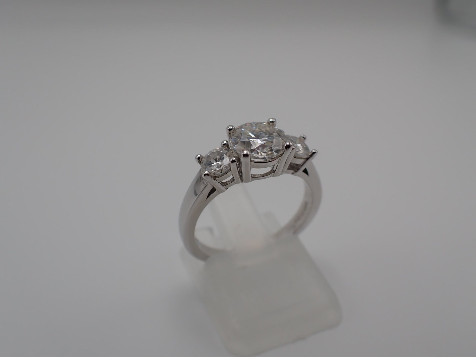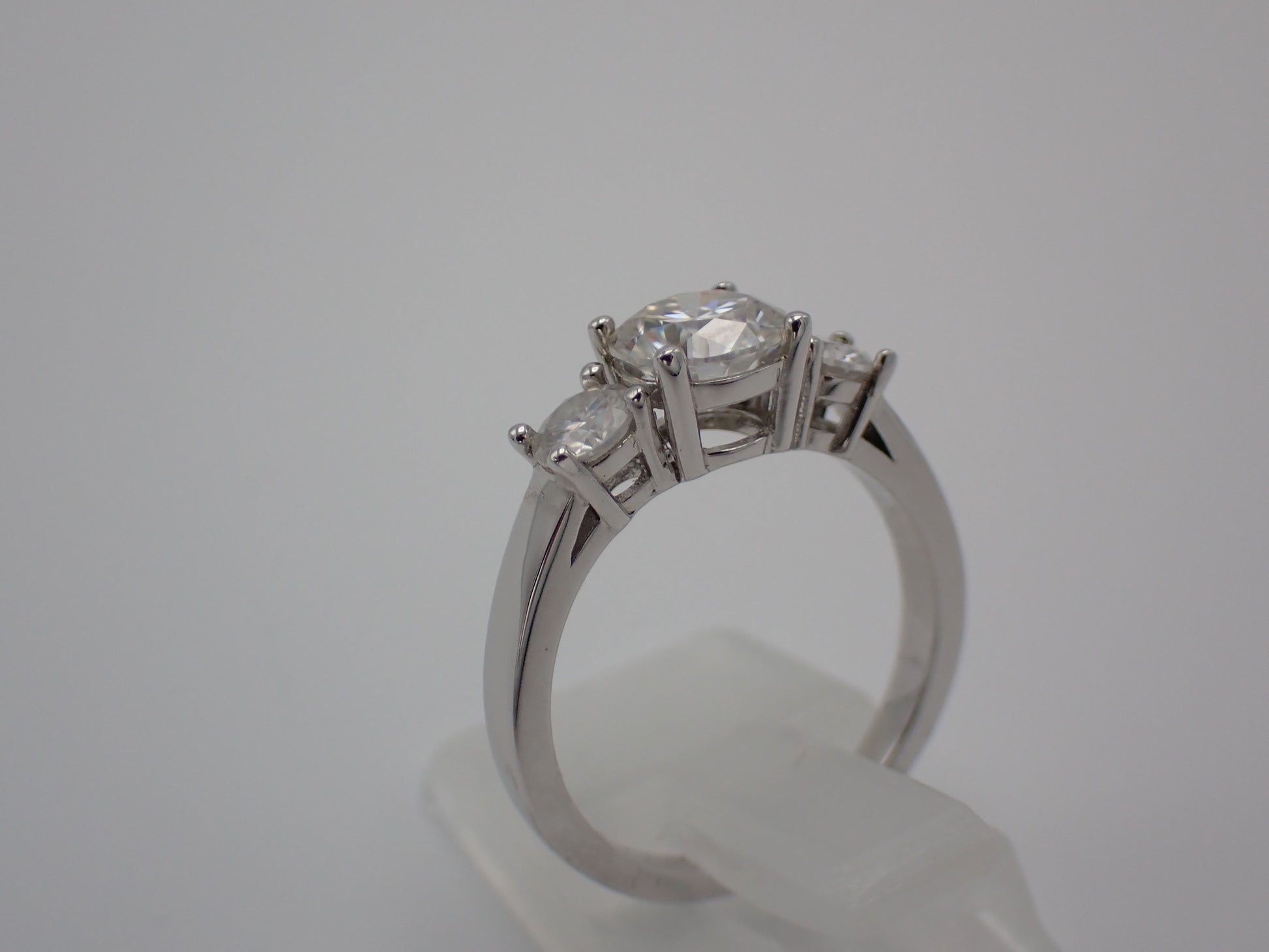 The Classic Trilogy Moissanite Ring – 1.0ct, Sterling Silver is a lighter, more understated version of our trilogy design. A brilliant 1.0ct round moissanite sits at the centre, framed by 0.60ct of sparkling side stones for a balanced, elegant look.