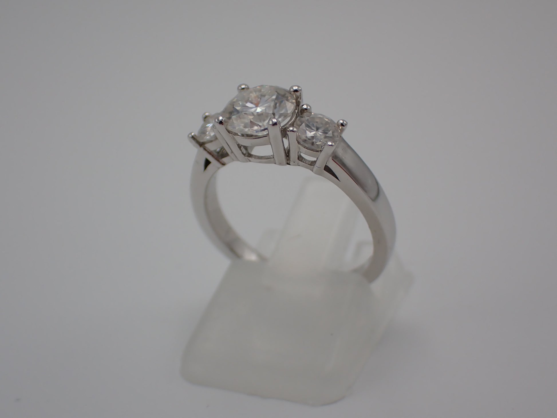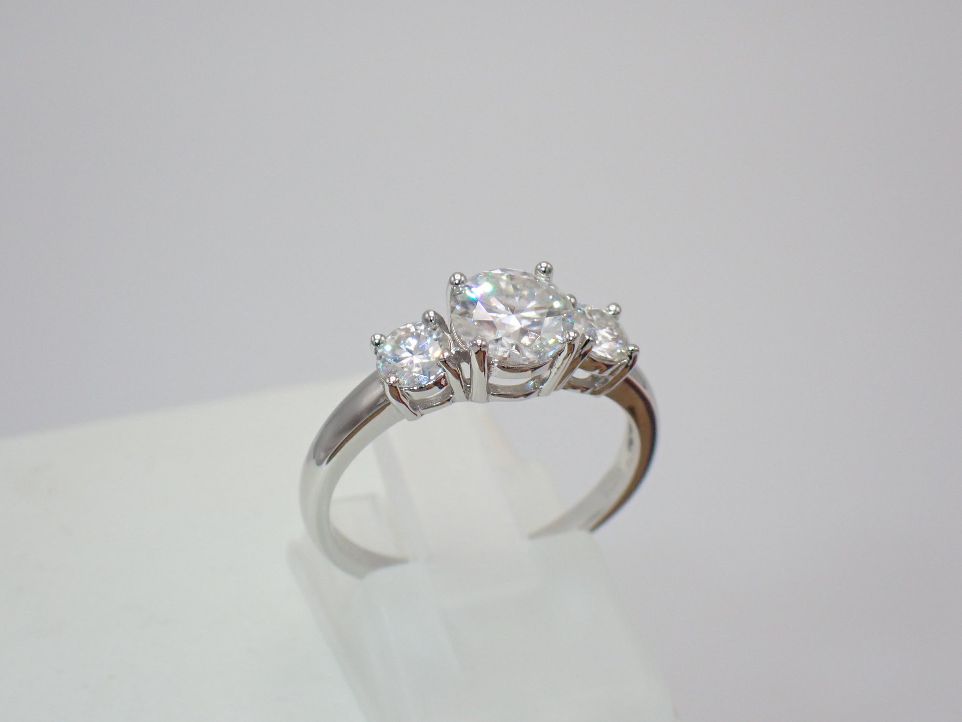 Set in 925 sterling silver with a bright white gold plated finish, the band is kept slim and polished so the focus stays on the stones. Together, the three moissanites total approximately 1.5 carats, giving you a generous, high-impact sparkle without feeling heavy on the hand.
