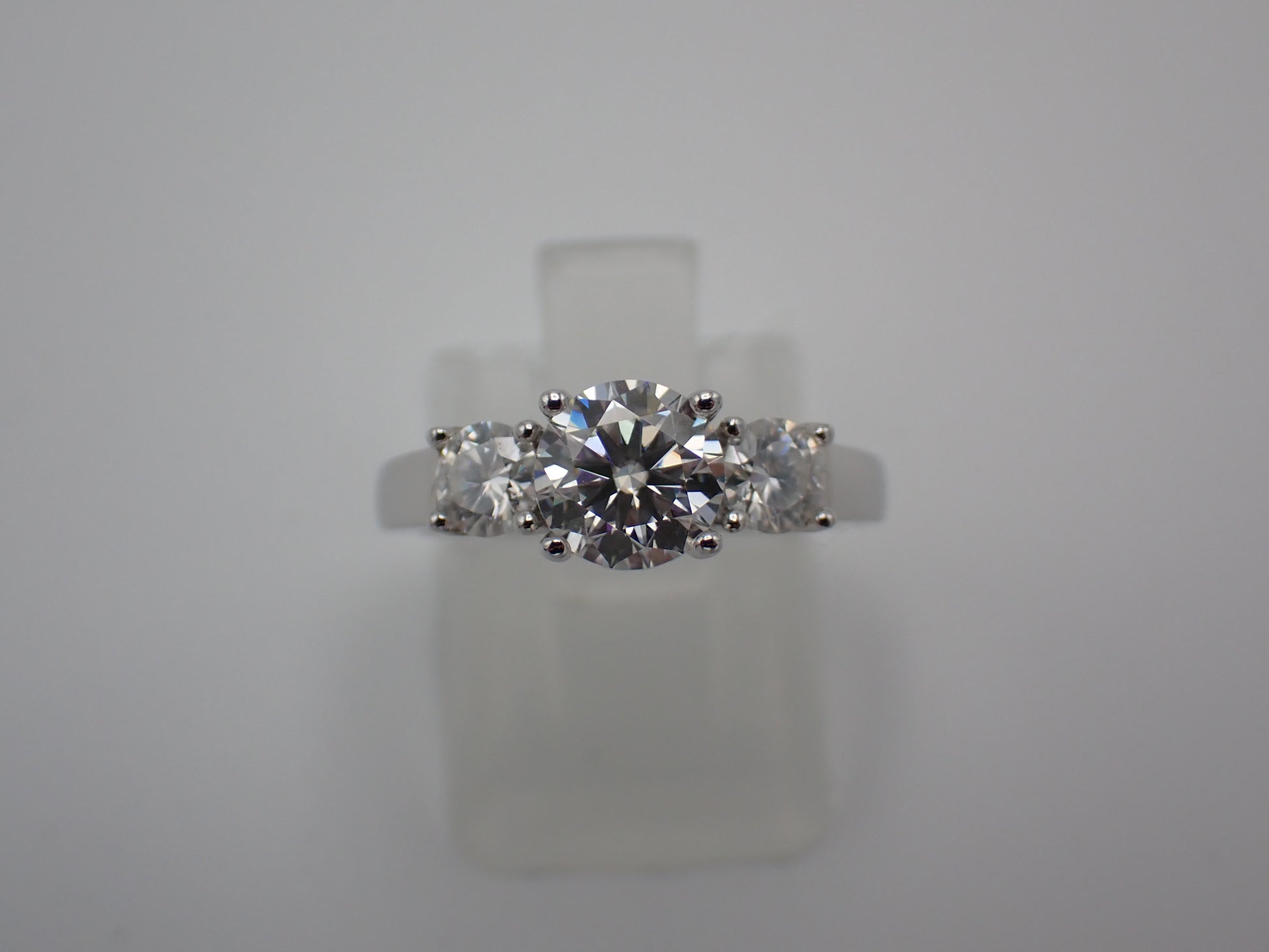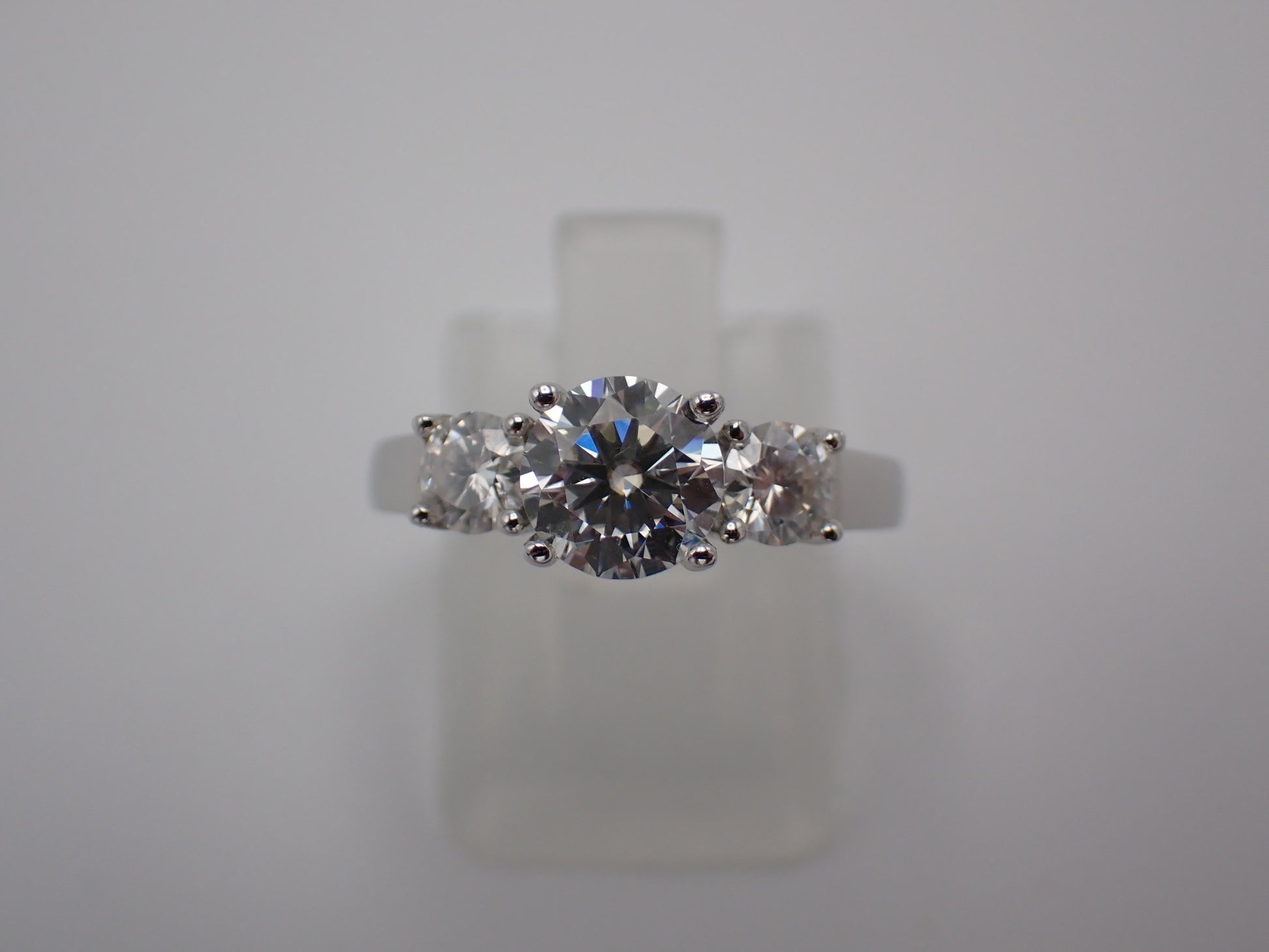 - Style: Classic three-stone trilogy ring with slim, polished band