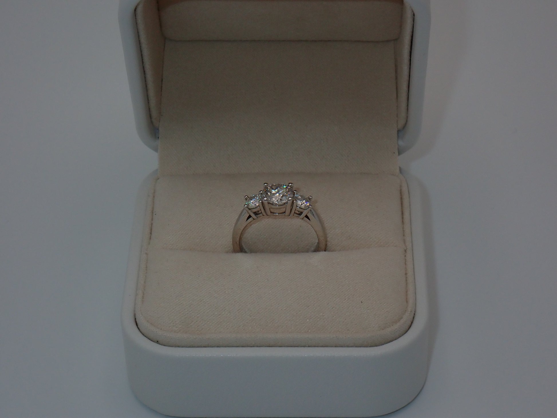 - Side stones: Two round moissanites, approx. 0.25ct each (4.0mm)