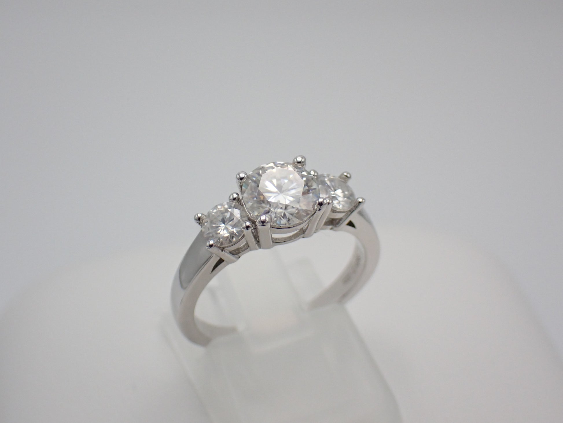The Classic Trilogy Moissanite Ring – 1.5ct, Sterling Silver is a modern take on one of the most loved ring styles of all time. A brilliant round moissanite centre stone is flanked by two slightly smaller rounds, creating a balanced three-stone look that feels elegant from every angle.