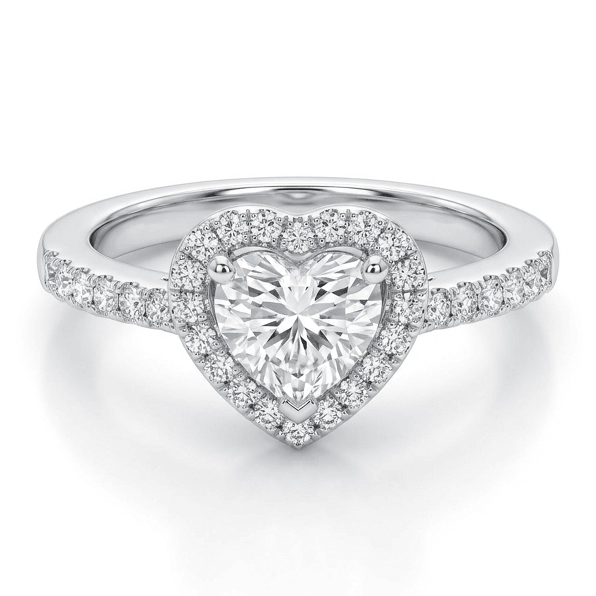 The Heart Halo Moissanite Ring with Pavé Band – 0.5ct, Sterling Silver is designed for anyone who loves romantic, meaningful detail. A brilliant 0.5ct round moissanite (5.0mm diameter) sits at the centre, surrounded by a sparkling heart-shaped halo of 24 pavé-set cubic zirconia accents that create a stunning, symbolic silhouette.