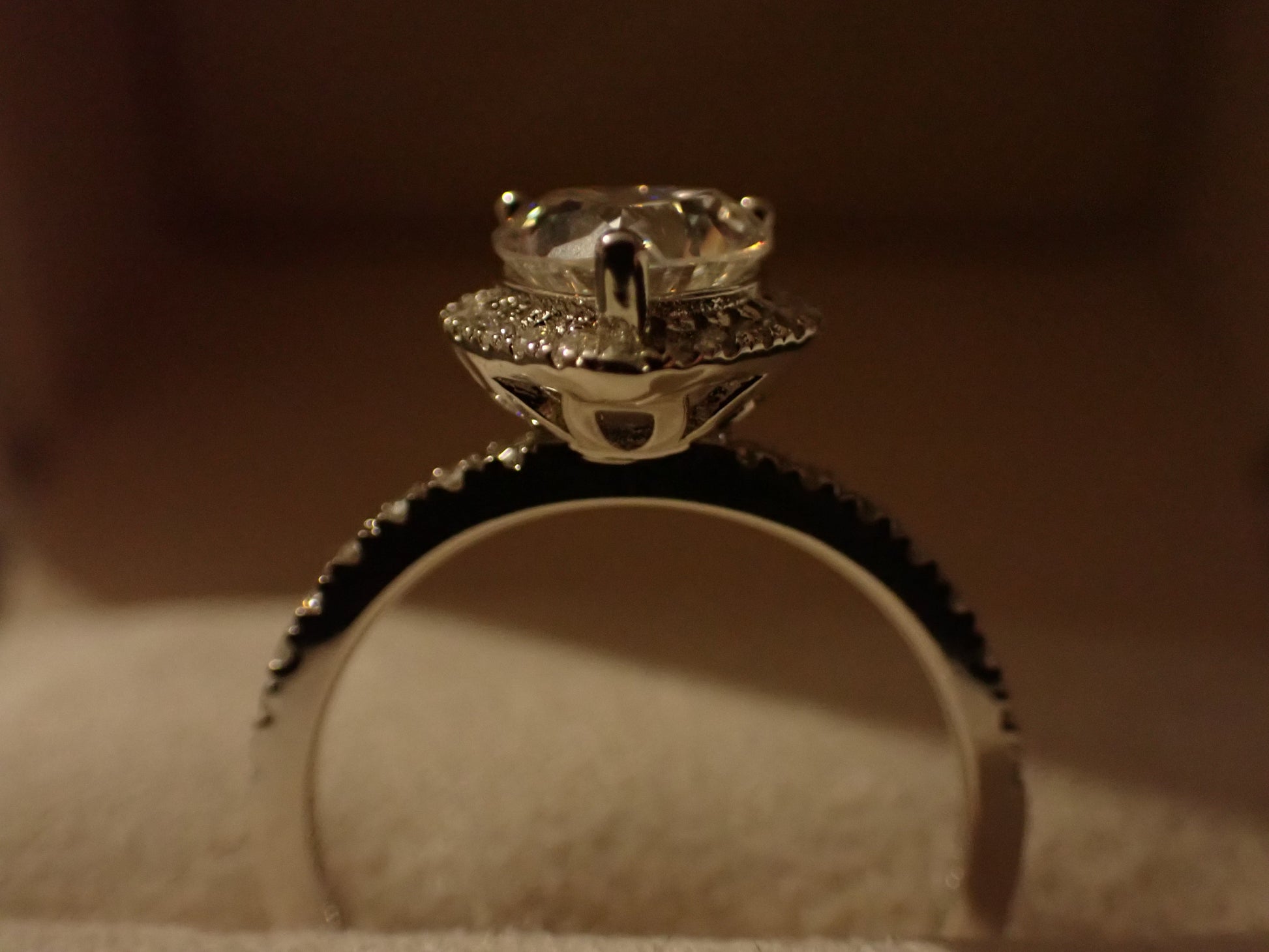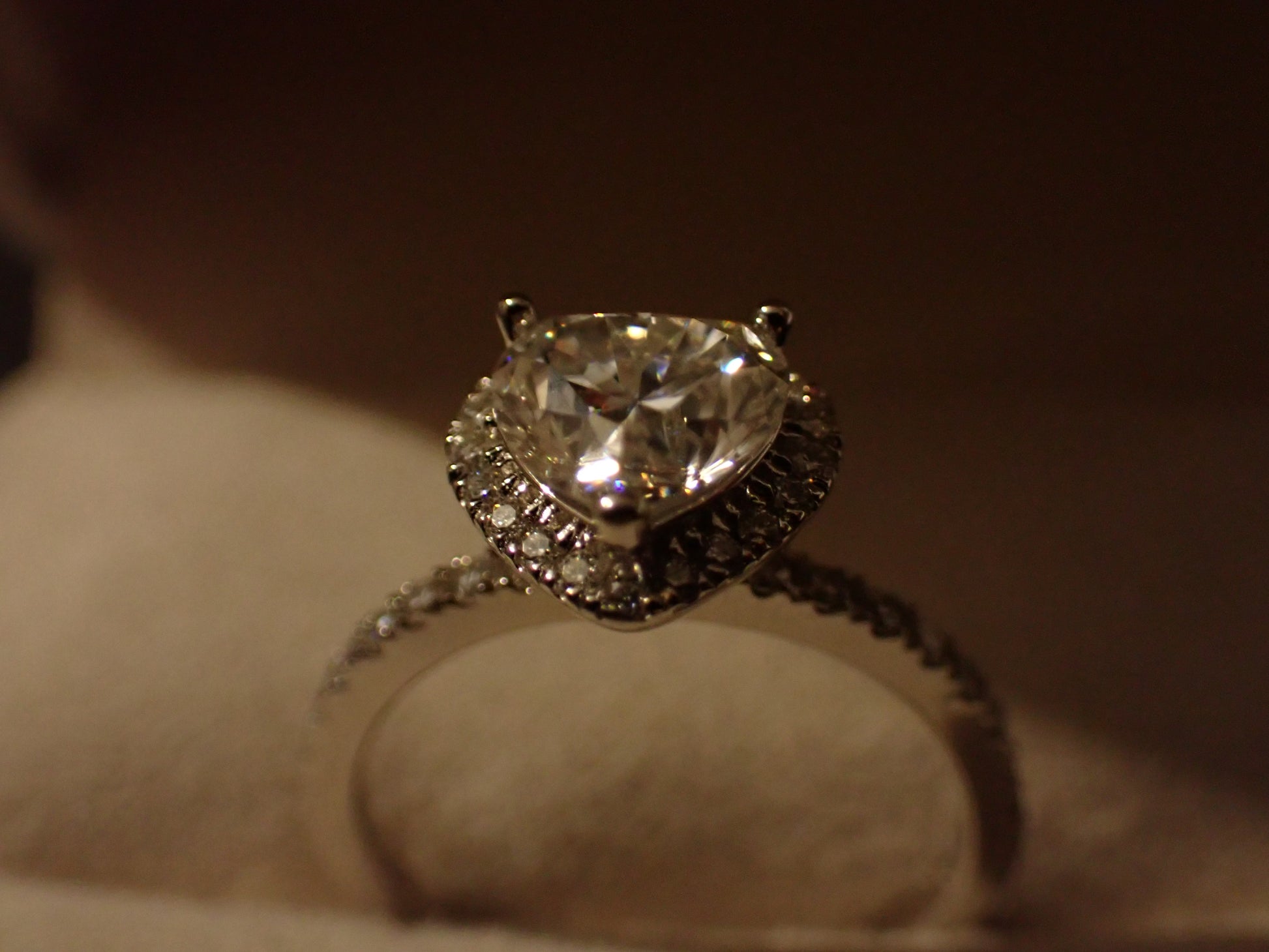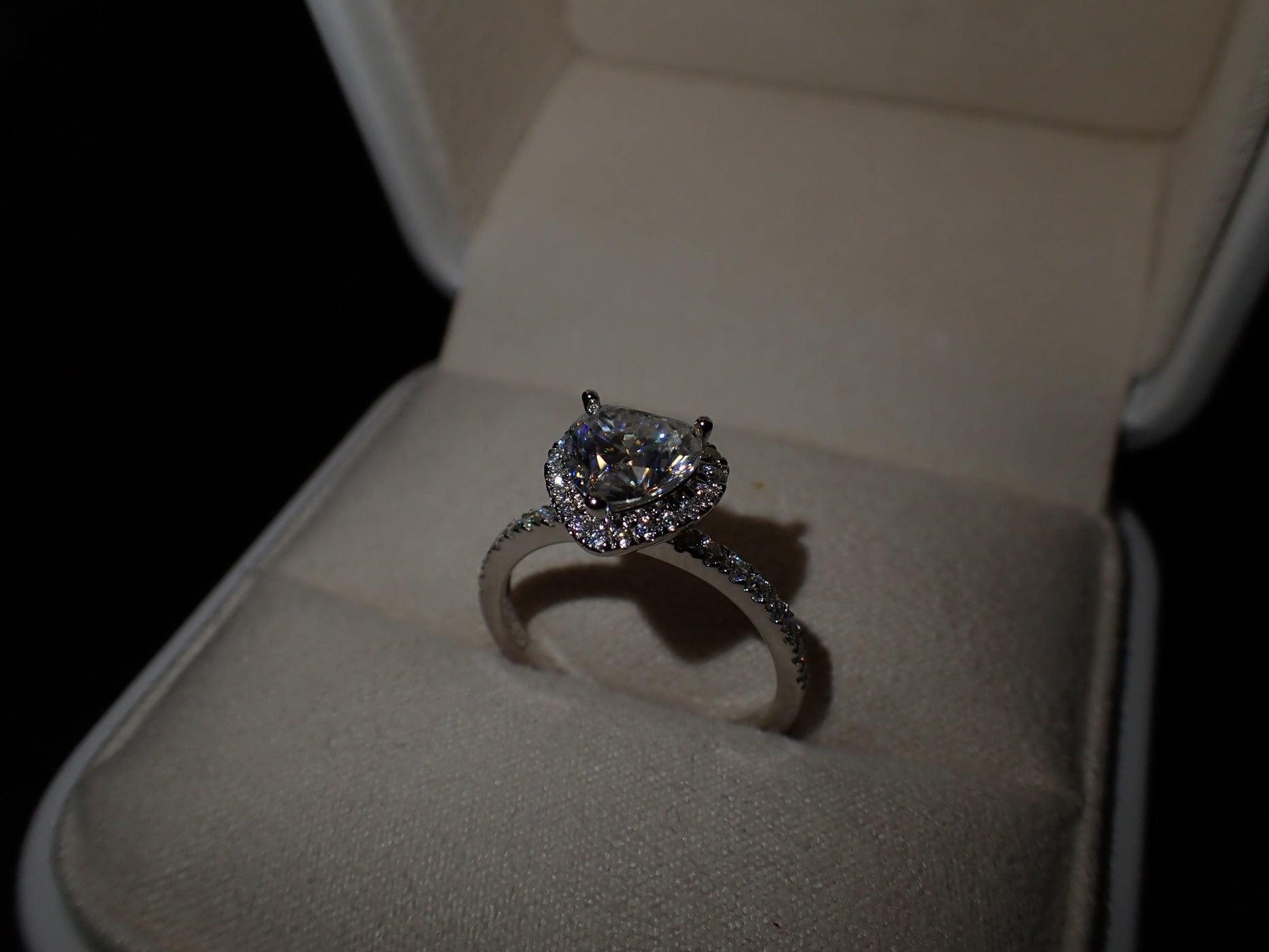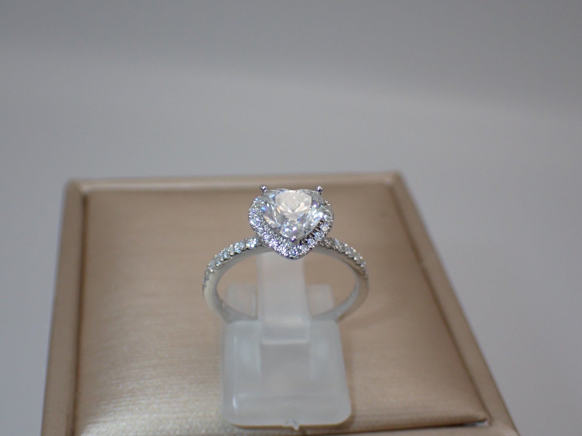 - Centre stone: 1.2ct heart-shaped moissanite, 7×7mm, colourless DEF colour