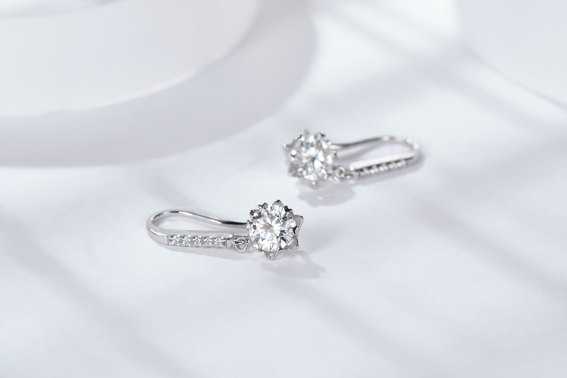 Moissanite Heart-Prong Drop Hook Earrings – 1.0ct Total (5.0mm), Sterling Silver are designed to sparkle with every movement. Each earring features a brilliant 5.0mm round DEF moissanite (0.50ct each, 1.0ct total per pair) set in our signature six heart-prong setting, creating a romantic twist on the classic drop earring. A row of shimmering white 5A cubic zirconia accents adds extra light-catching detail along the front of the hook for a refined finish. Crafted in highly polished sterling silver, these earrings are perfect for gifting or elevating your everyday look.