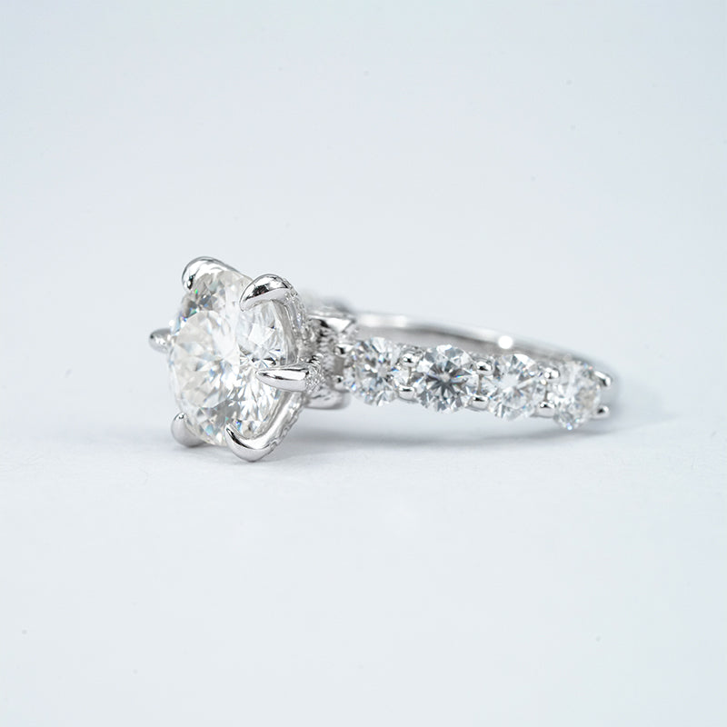 • Accent stones: Multi-size round moissanites for extra sparkle