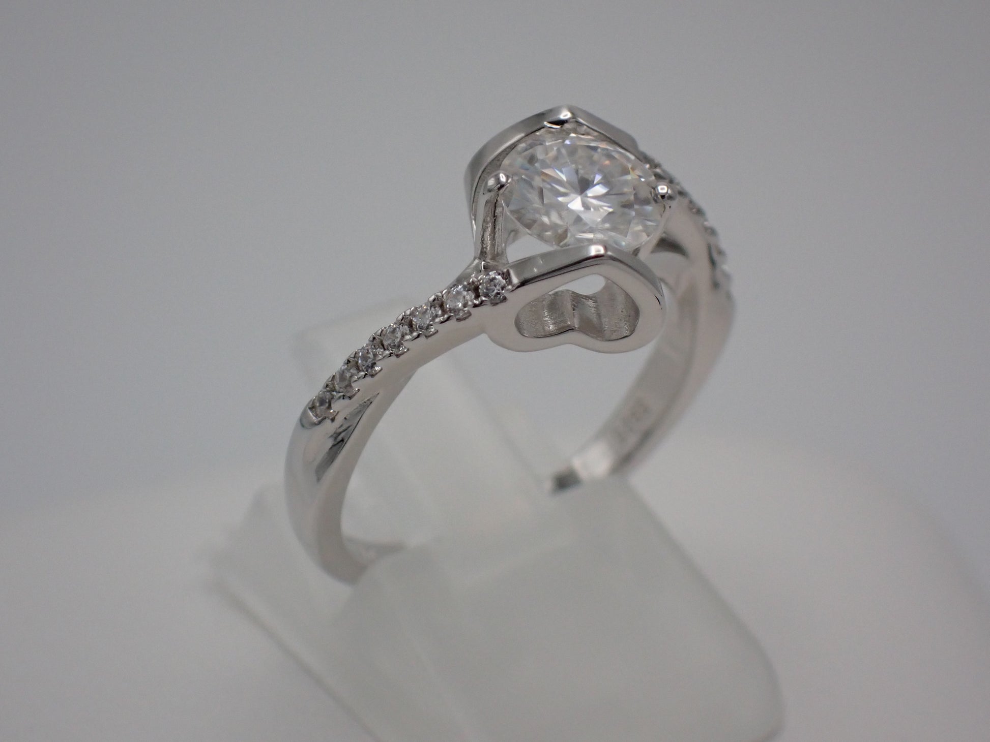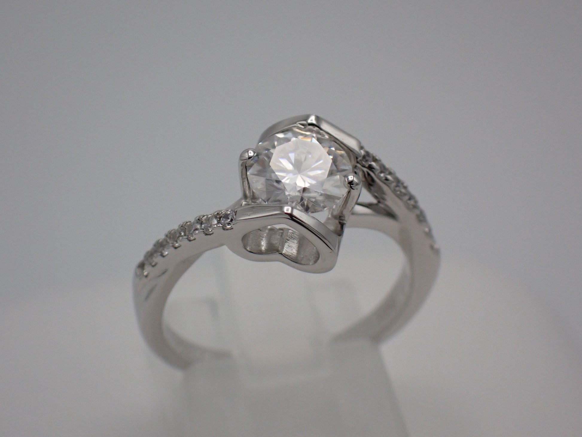 - Side stones: 14 pavé-set cubic zirconia accents (1.3mm) along the twisted shoulders